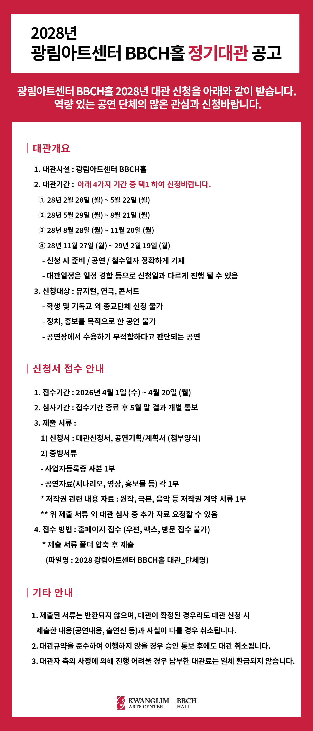 2028년 광림아트센터 BBCH홀 정기대관 공고